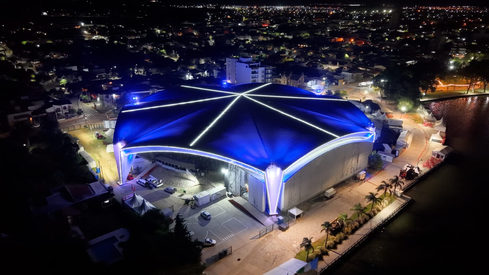 Además, se sumó un sistema de neón perimetral que recorre el contorno del techo del Anfiteatro, incluyendo patas estructurales y cenefas. Esta incorporación permite resaltar el volumen arquitectónico del edificio y reforzar su presencia como referencia histórica, cultural y urbana del paisaje villamariense.